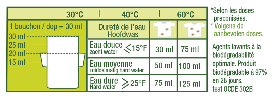 - En machine : 30 à 125 ml selon la dureté de l'eau et la saleté du linge.
