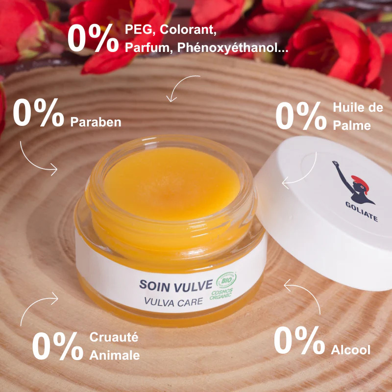 Fabriqué en France, de qualité supérieure, la recette du soin vulve est unique et exclusive à GOLIATE. Elle a été créée sur-mesure par un laboratoire artisanal, en collaboration avec l’équipe de GOLIATE pour lutter contre l’irritation et l’inconfort intime et les sécheresses vaginales grâce à ses propriétés hydratantes.